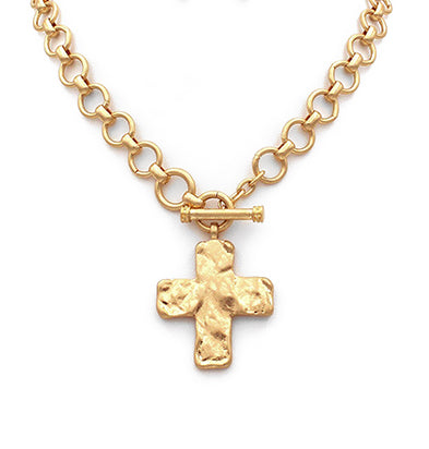 The Anjelica Necklace adds a bold edge to any look with a havy chain, a statement toggle, and a classic cross pendant.