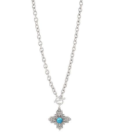 The Camille Byzantine Cross & Stone Necklace blends intricate cross motifs with rustic stone accents for a distinctive western style.