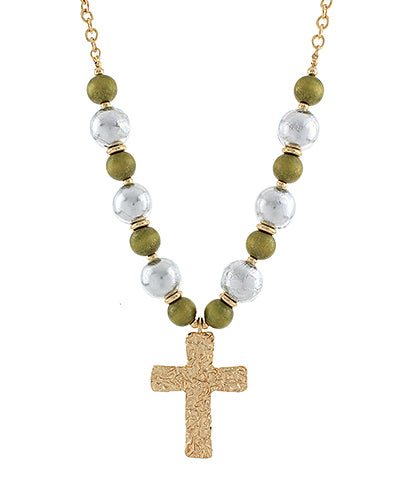 - Features: Hammered cross, woodball beading
