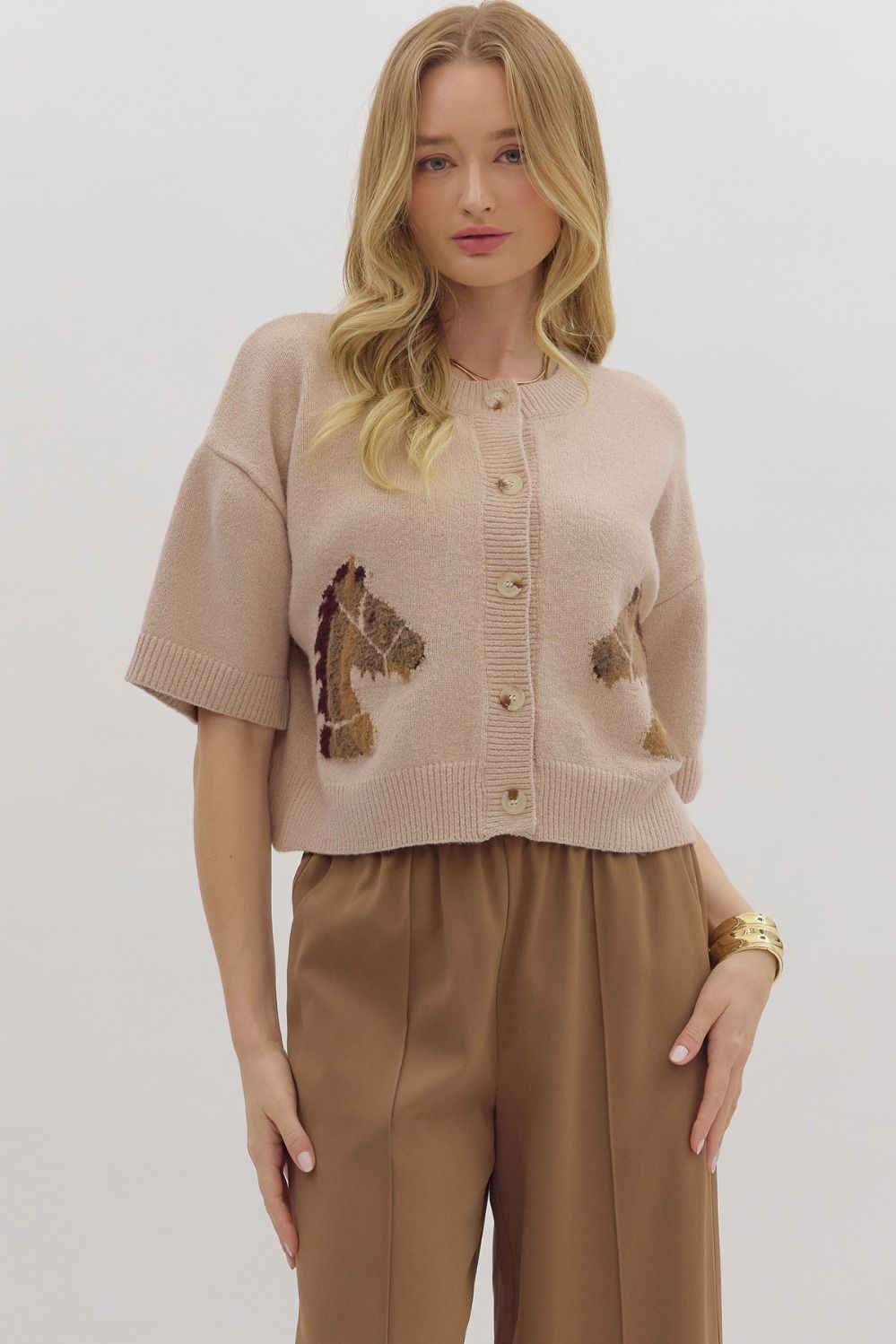 The Delphine Horse Knit Sweater Top features a charming equestrian motif, ribbed trim, and a classic button-front design in a soft, medium-weight knit.