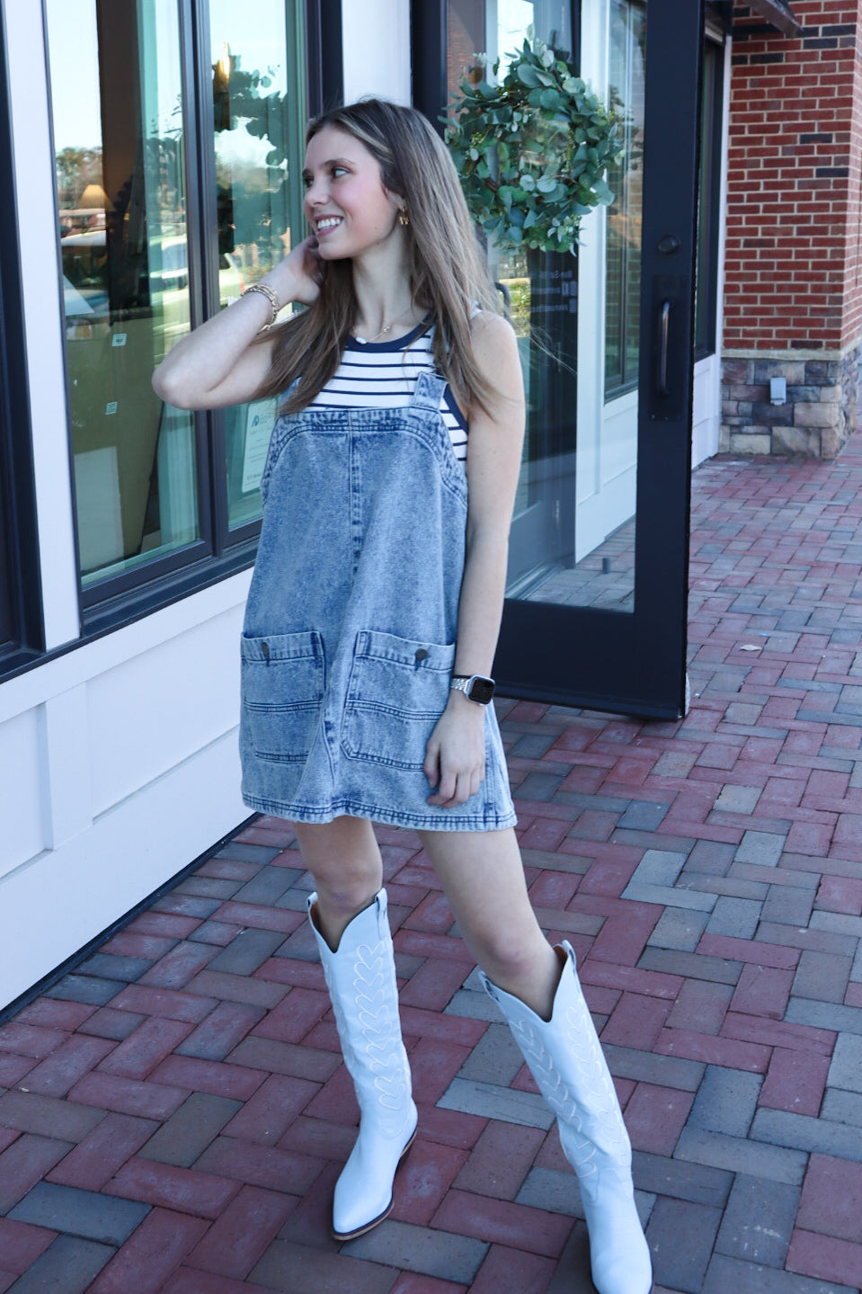 Be the embodiment of cuteness in our Jazmine Denim Dress. This versatile overall-style dress is perfect for all seasons. Super cute (just like you!), you'll be turning heads and feeling fabulous no matter where you go.