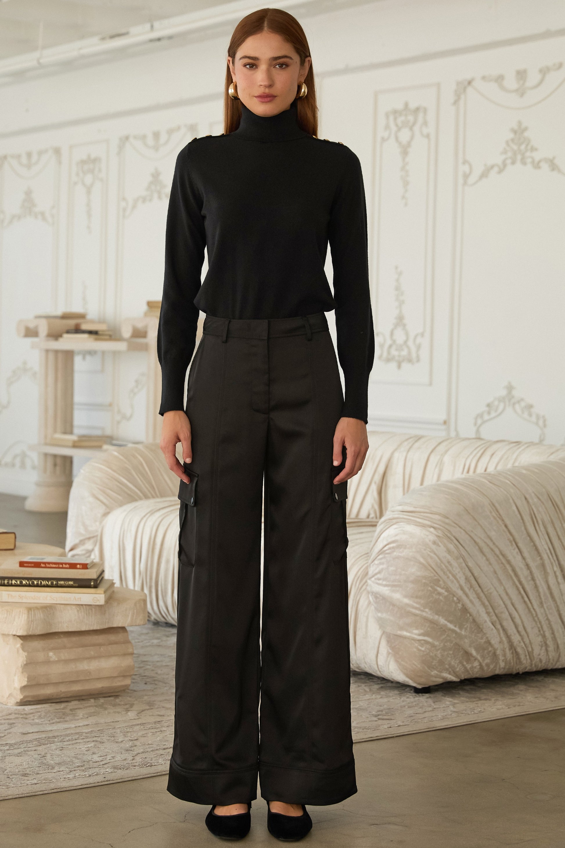 A chic turtleneck sweater with button accents for timeless elegance and cozy style.