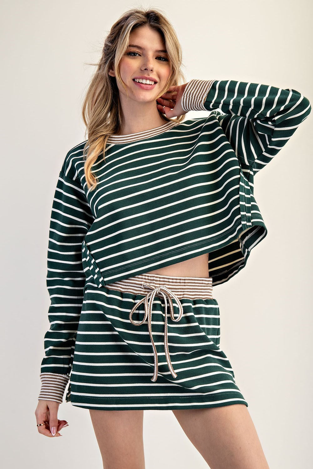 The Maisel Pullover is a striped cropped top with dropped shoulders, contrast ribbed trim, and exposed seaming—soft, stylish, and effortlessly casual.