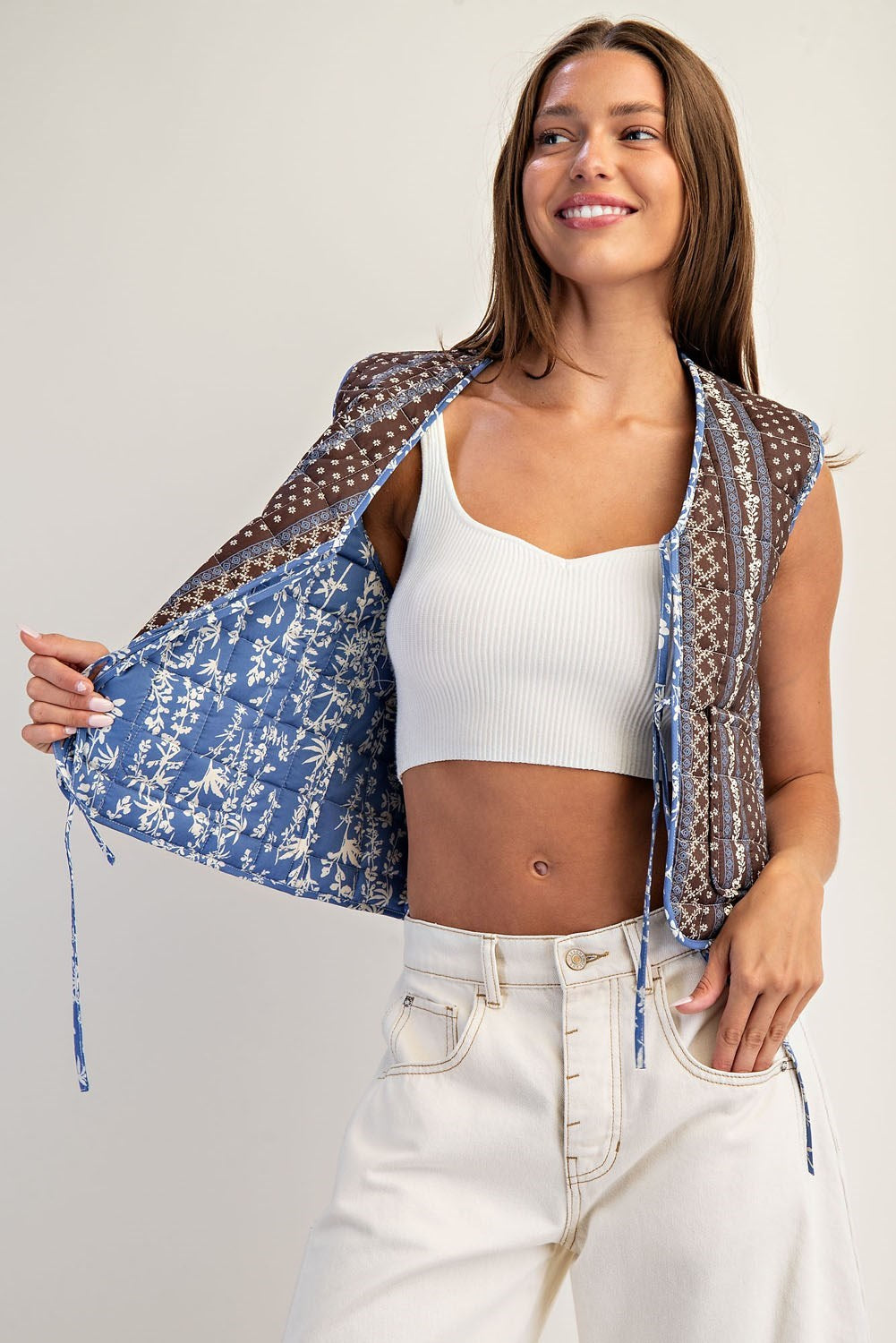 Double the charm—this reversible quilted vest features vintage florals and soft texture for effortless layering.