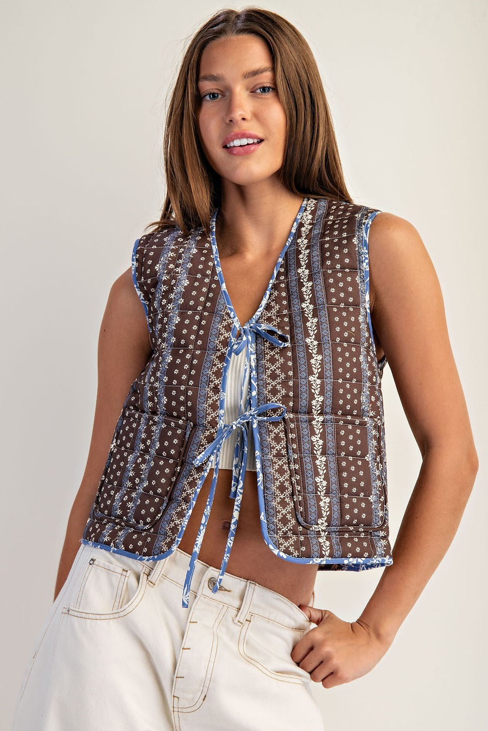 The Willa Reversible Quilted Vest offers two beautiful looks in one cozy piece. One side showcases a vintage-inspired striped floral print, while the other reveals a delicate blue floral lining, both framed with contrast blue binding. Designed with front patch pockets and a double tie-front closure, this vest brings comfort and character to your layered looks. Its lightweight quilting and reversible styling make it a must-have for transitional days or breezy summer evenings.